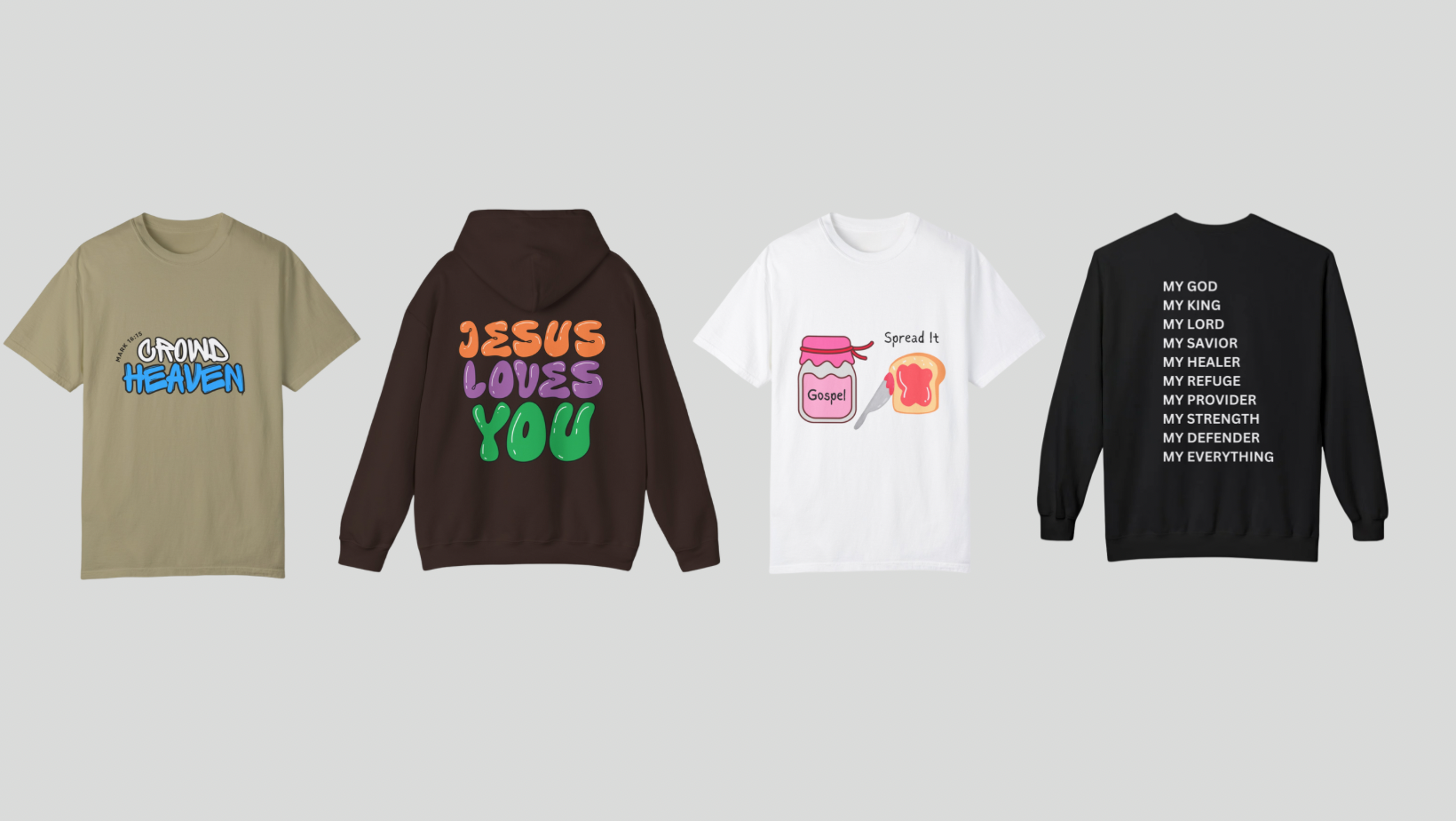 You have the opportunity to share the gospel of Jesus Christ to hundreds of people each day without speaking a single word. Our brand offers a comfortable yet stylish way to fulfill what God asks from us and introduce people to the love of Christ.