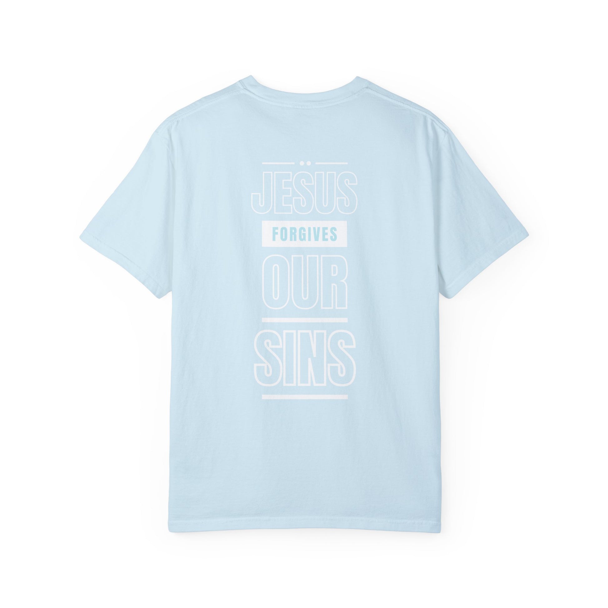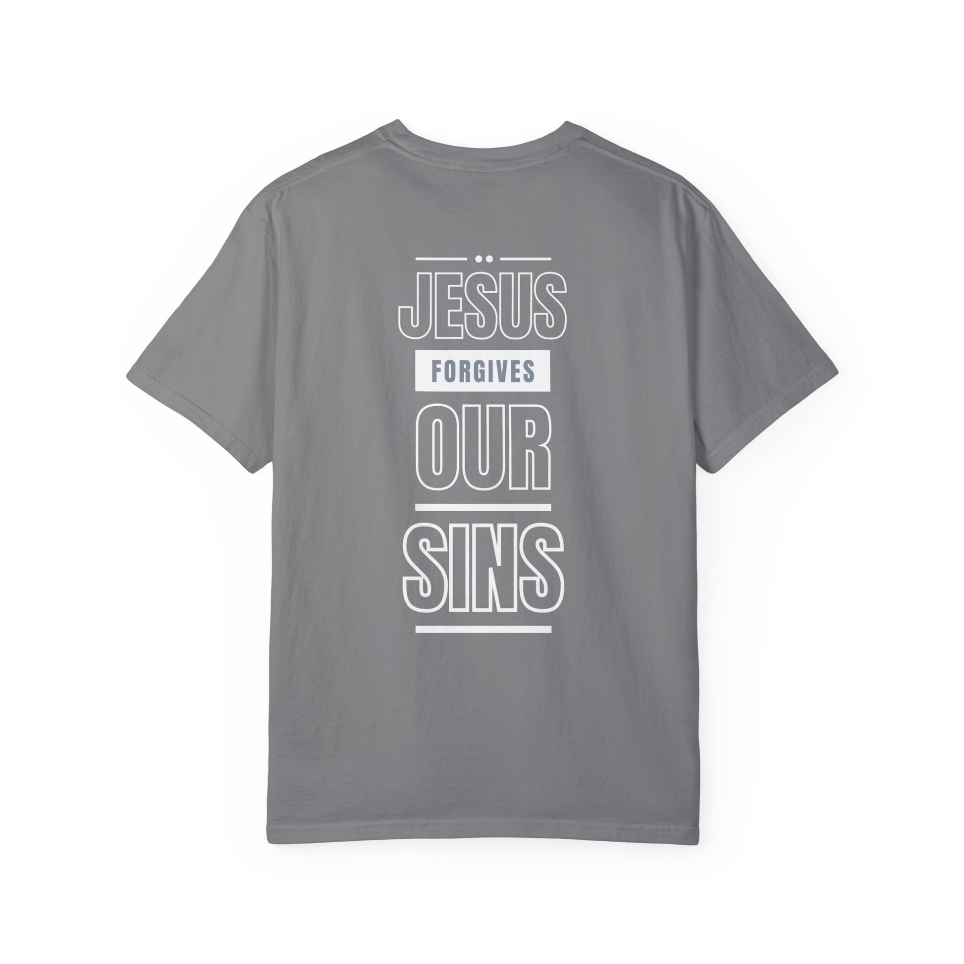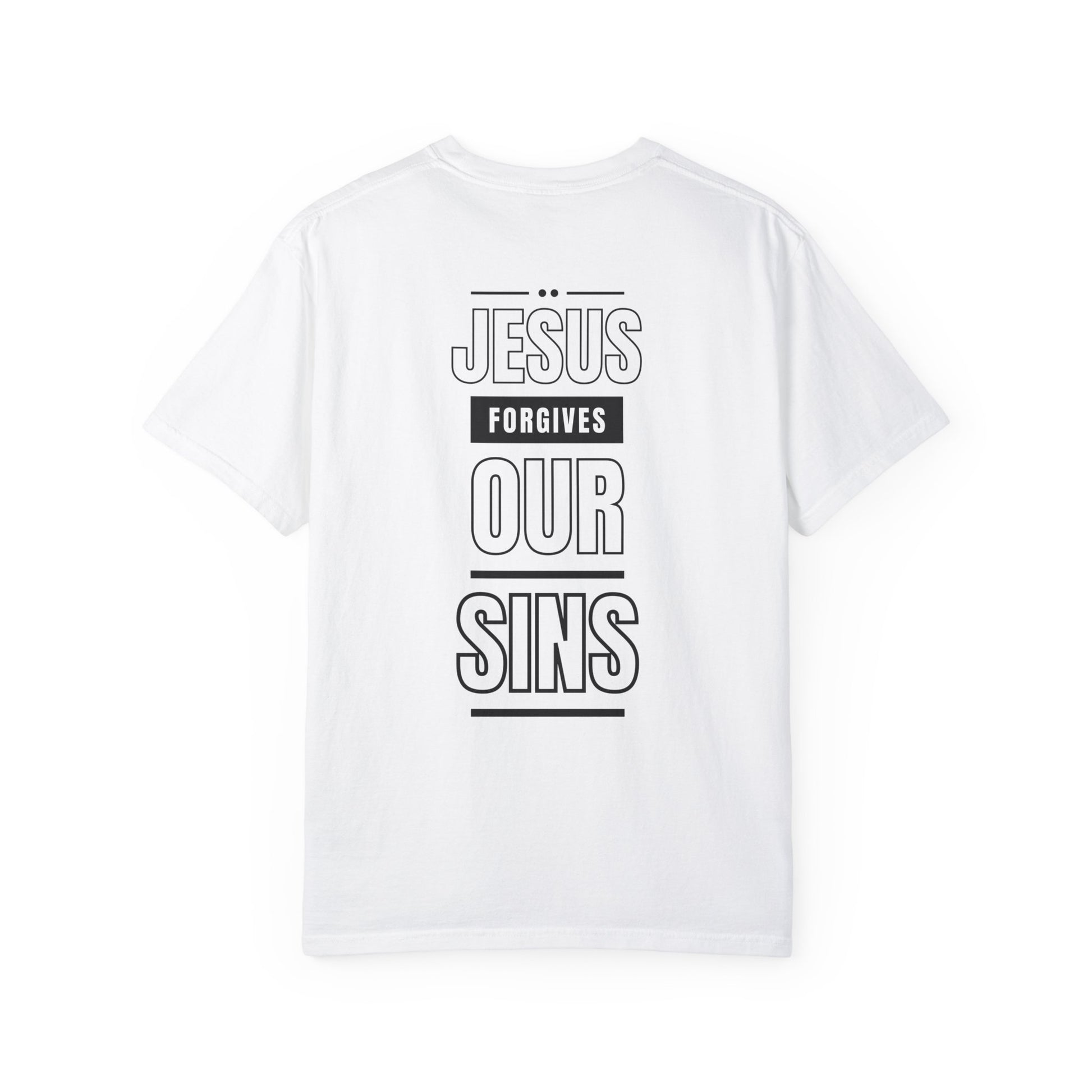 Jesus forgives, but a lot of people believe that their sins are unforgivable or that Jesus won't forgive them because they aren't Christian. With this tee you can tell people that Jesus will forgive them, all they have to do is turn to him and repent.
